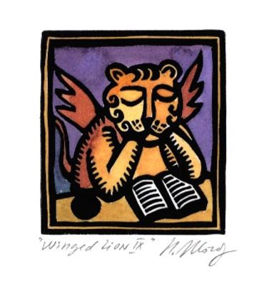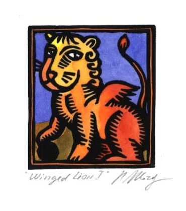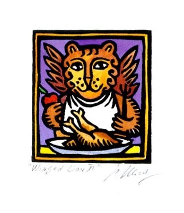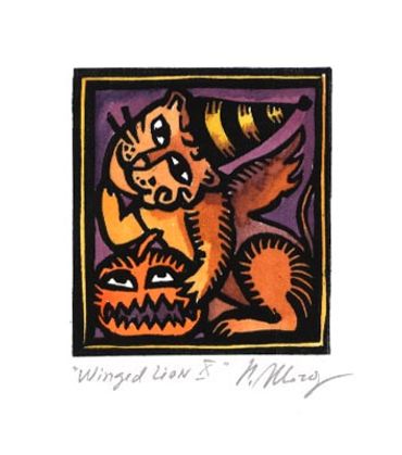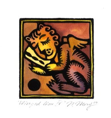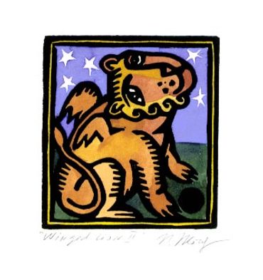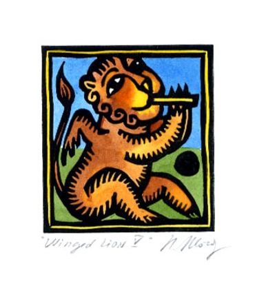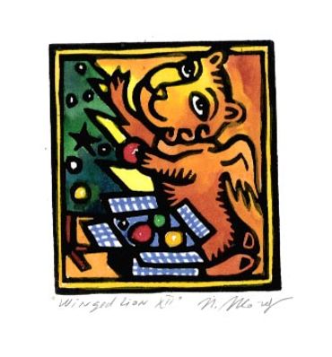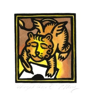 Winged Lions are my favorite mythological creatures. I started this series of small greeting-card-sized linocuts in 2004 and now have a series of prints where my winged lions do everything: stargaze, draw, sunbathe, decorate Christmas tree, and more. Available to view and purchase at my online store.